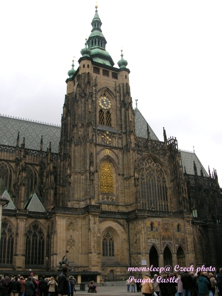 聖維塔大教堂側面有座30公尺高的鐘塔,塔面有魯道夫二世增建的金色之窗,塔旁有